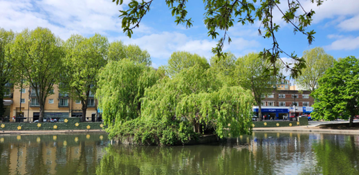 As proposed in the original 2017 Masterplan, the visibility of Feltham Pond from the High Street has been improved, the historic staggered seating steps have been reinstalled and the surrounding area repaved. Resin-bound porous paving has been introduced to allow greater permeability and allow maintenance vehicles to operate without ruining the terrain.