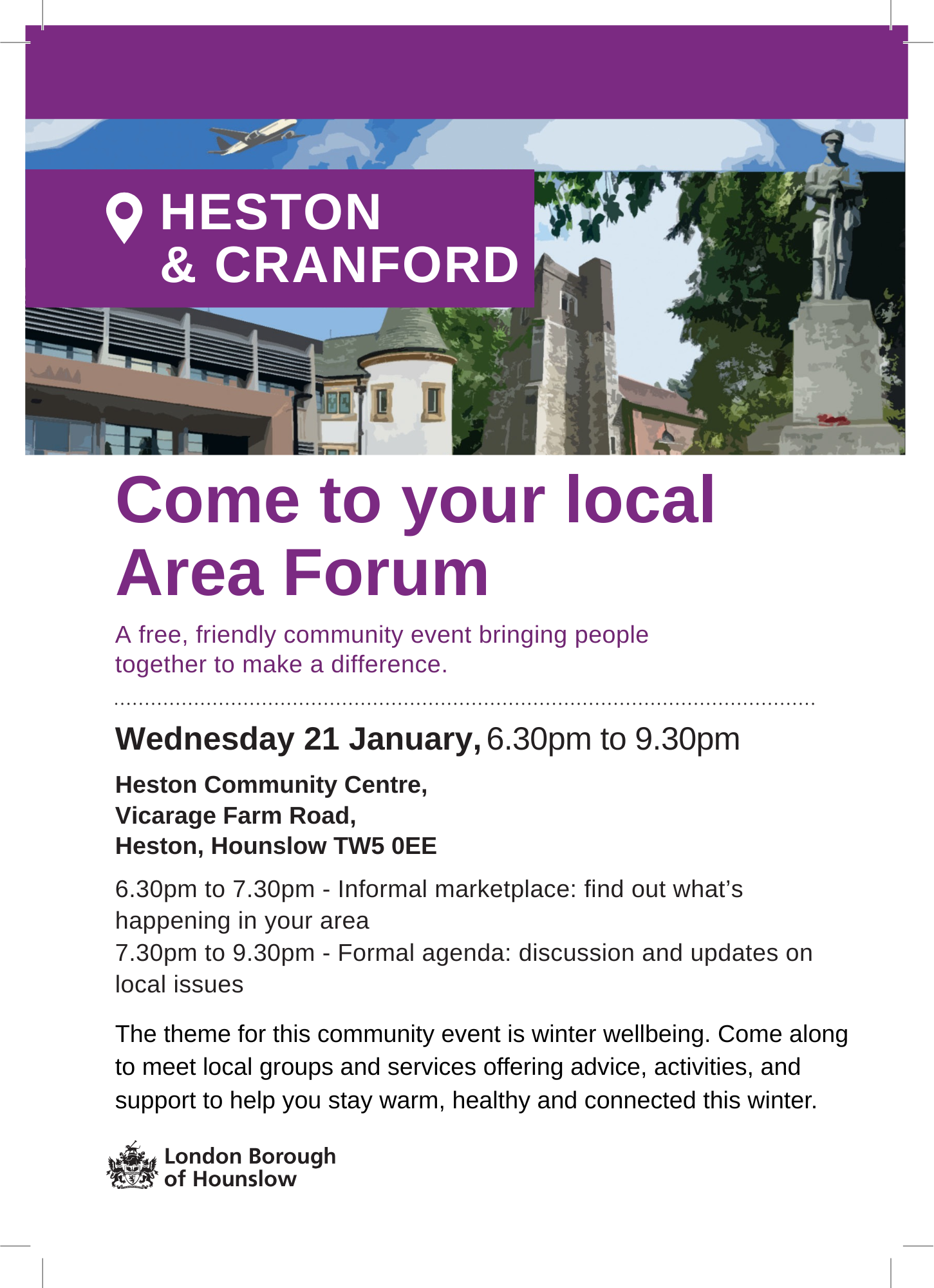 Come along to the upcoming Heston & Cranford Area Forum on Wednesday 21st January, from 6:30pm to 9:30pm at Heston Community Centre, Vicarage Farm Rd, Heston, Hounslow TW5 0EE.