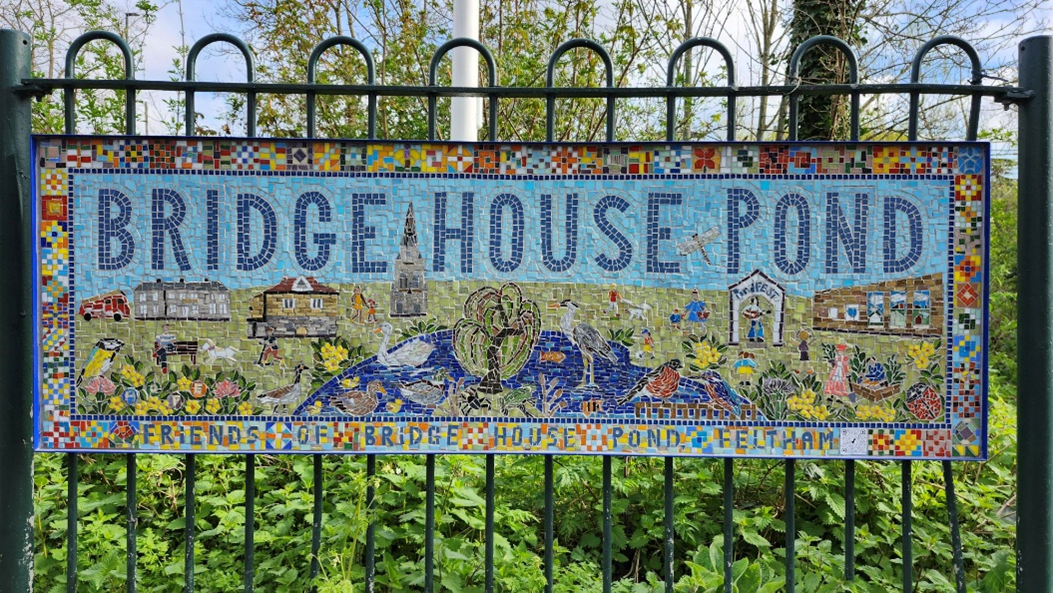 This mosaic sign was unveiled on 7th October 2024 by the Mayor of Hounslow, Councillor Karen Smith at Bridge House Pond. It had been created by Hounslow Mosaic and Community Artist Susie John who had involved around 200 residents and council officers in making this public artwork. Susie ran a number of workshops in Feltham for the public to create their own mosaics for the border, then worked with the community mosaic group based at Feltham Belvedere House to create mosaic objects resembling Feltham and Bridge House Pond as suggested by Feltham people. The mosaic sign, replacing the existing banner was installed by Paul Gibbinson from Hounslow Men's Shed.