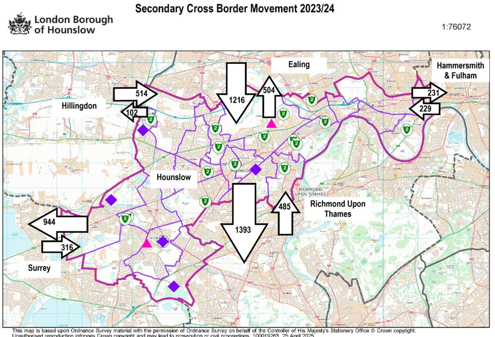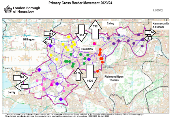 The fall in pupil numbers in Hounslow has led to a growing number of surplus spaces, particularly in primary schools. The maps below show this, highlighting the movement of pupils across the border to schools in other Local Authority areas.
